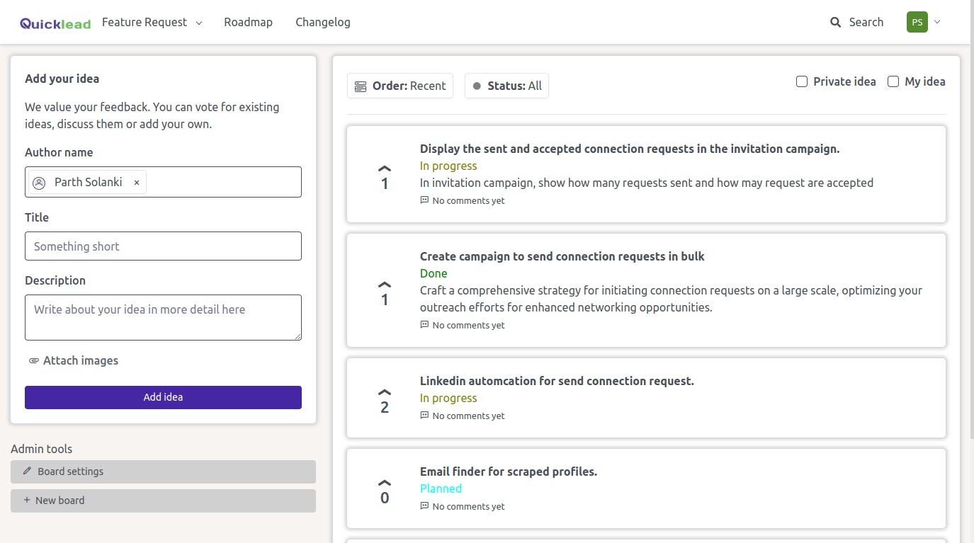 Users have the option to submit their ideas right from the boards by utilizing the idea form located on the left side of the screen.